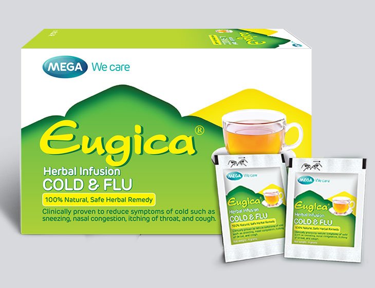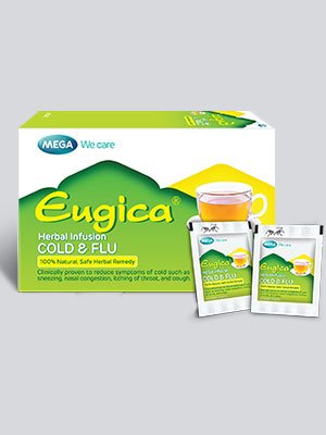 EUGICA HERBAL INFUSION គឺជាការលាយបញ្ចូលគ្នានៃសមាសធាតុផ្សំរុក្ខជាតិឱសថដែលមានការសិក្សាគ្លីនិក ដូចជា ខ្ញី, ម្រេចខ្មៅ, ម្រេចវែង, coriander, calumba false, siritekku, vishnukranthi, cumin, vasaka (malabar nut), omum, galangal, kantakari, parpataka (diamond flower) & liquorice ដែលមានប្រសិទ្ធភាពសម្រាប់ការការពារ និងព្យាបាលរោគសញ្ញានៃជំងឺ ផ្តាសាយ។ វាអាចជួយគ្រប់គ្រងជំងឺផ្តាសាយ តាមបែបធម្មជាតិ ដោយគ្មានផលរំខាន និងចូលរួមកាត់បន្ថយការប្រើប្រាស់ឱសថអង់ទីប៊ីយោទិច។