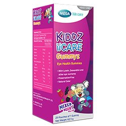 KIDDZ IICARE GUMMYZ ត្រូវបានបង្កើតឡើងជាទម្រង់ចាហួយ ដើម្បីជួយដល់ភ្នែក និងការមើលឃើញអោយកាន់តែល្អប្រសើរ ក៏ដូចជាកាត់បន្ថយផលប៉ះពាល់នៃពន្លឺពណ៌ខៀវដែលបង្កគ្រោះថ្នាក់ចំពោះភ្នែកកុមារ និងផ្តល់ការការពារប្រឆាំងនឹងអុកស៊ីតកម្មចំពោះភ្នែក។