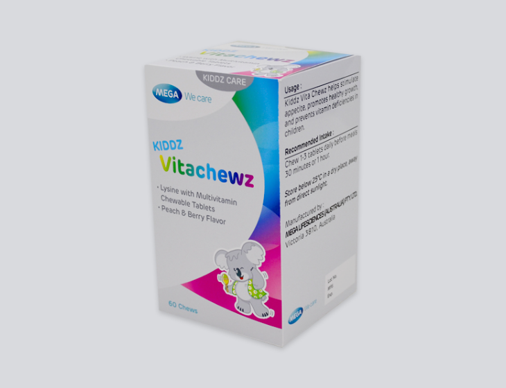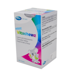 KIDDZ Vitachewz គឺជារូបមន្តវីតាមីនចម្រុះដែលអាចទំពារបាន រួមផ្សំជាមួយសារធាតុ Lysine ដែលបង្កើតឡើងជាពិសេសដើម្បីជំរុញដល់ចំណង់អាហារ ជំរុញការលូតលាស់សុខភាពល្អ និងបង្ការកង្វះវីតាមីនចំពោះកុមារ។ Lysine គឺជាអាមីណូអាស៊ីតមួយប្រភេទ ដែលរាងកាយត្រូវការសម្រាប់ការលូតលាស់ និងជួសជុលជាលិកា។ KIDDZ Vitachewz គឺជាមធ្យោបាយងាយស្រួលមួយក្នុងការជួយឱ្យកុមារមានសុខភាពល្អ។ វាមានជាគ្រាប់អាចទំពារបានរាងសត្វខ្លាឃ្មុំ koala និងមានរសជាតិផ្លែប៉េស និងផ្លែប៊ឺរី។